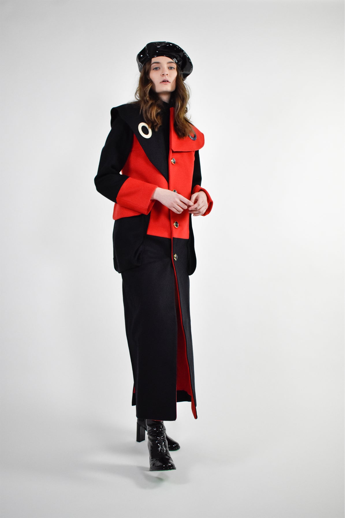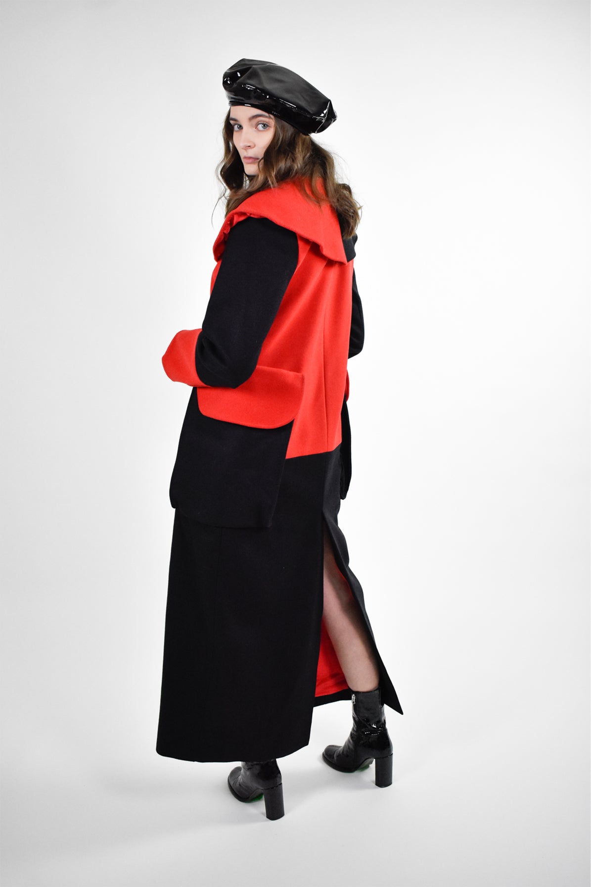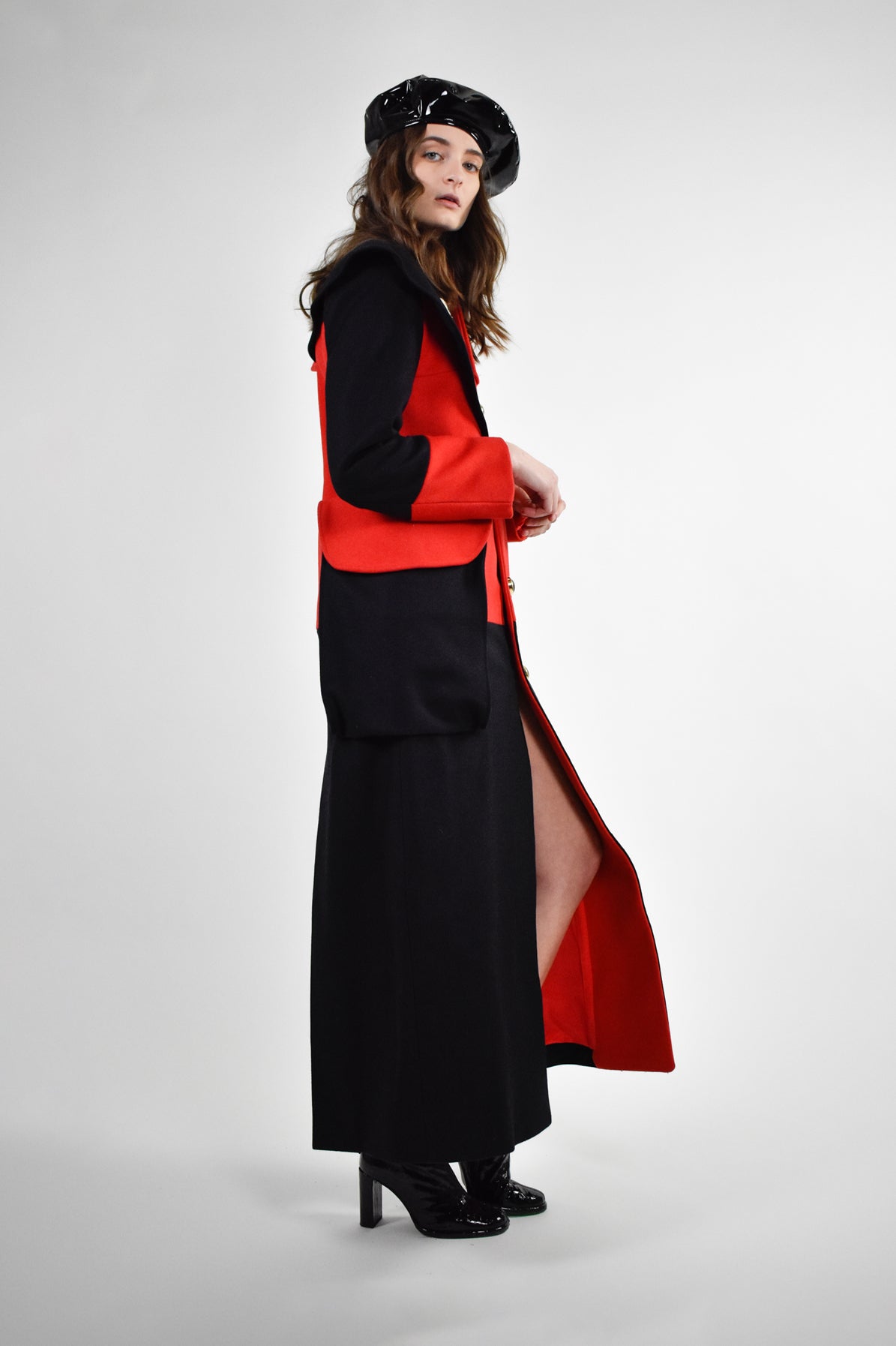 Ce manteau long à revers asymétriques offre un contraste de couleur unique. Confectionné en laine de grande qualité, il est rehaussé de deux grandes poches latérales à rabat qui lui donnent une allure moderne et son intérieur dévoile une doublure en crêpe de soie. Cette pièce avant-gardiste rehaussera toutes vos tenues avec une pointe d’audace et d’élégance.
