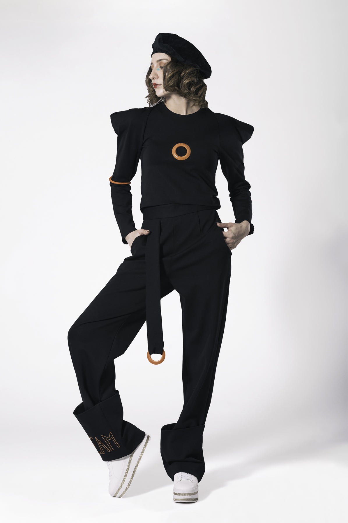 Le pantalon DREAM nous fait rêver avec ses grands revers brodés et sa lamelle se terminant avec un anneau décoratif. Ce pantalon taille haute saura apporter du caractère à votre tenue et fera tourner les yeux.