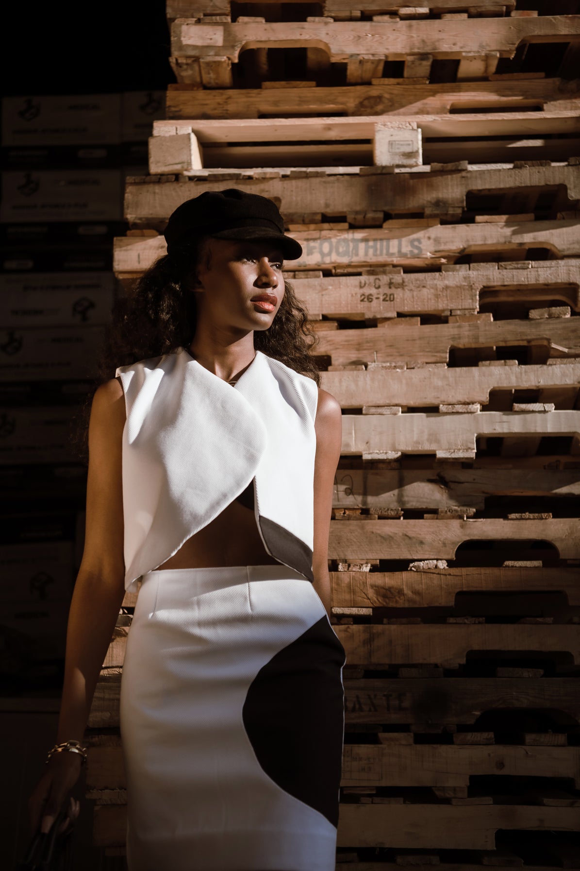 L'asymétrie de cette veste sans manche se remarque avec la découpe horizontale bleu marine. C'est une pièce originale, unique et dont la créativité reste au rendez-vous. Cette veste épurée se prêtera aussi bien à des tenues habillées que décontractées.