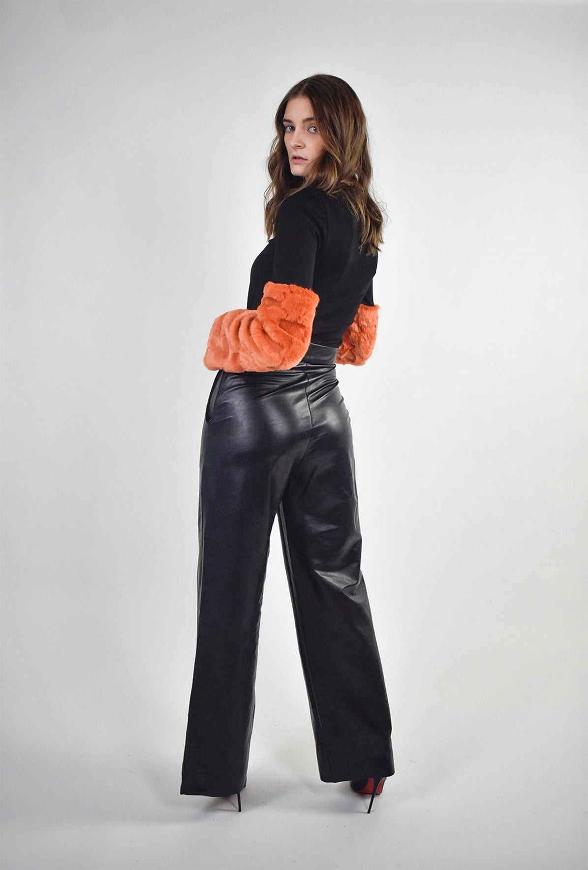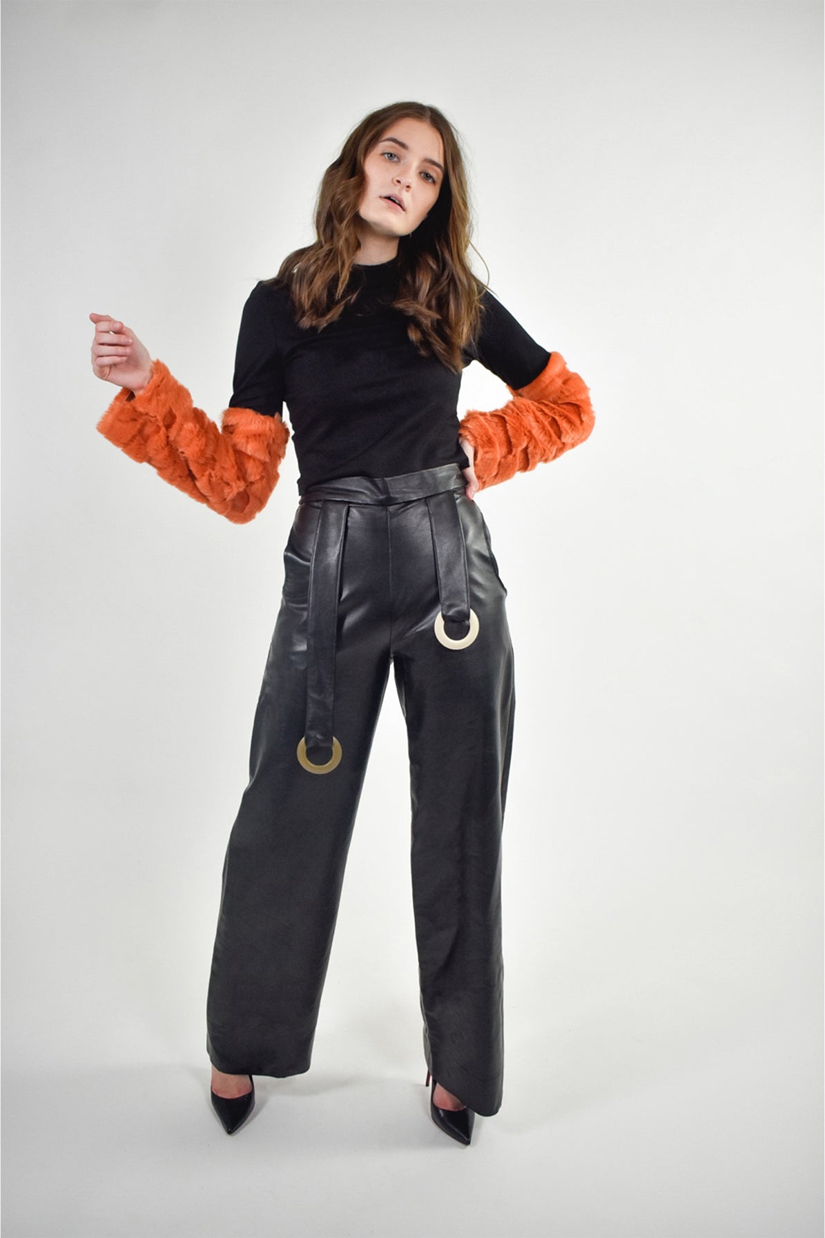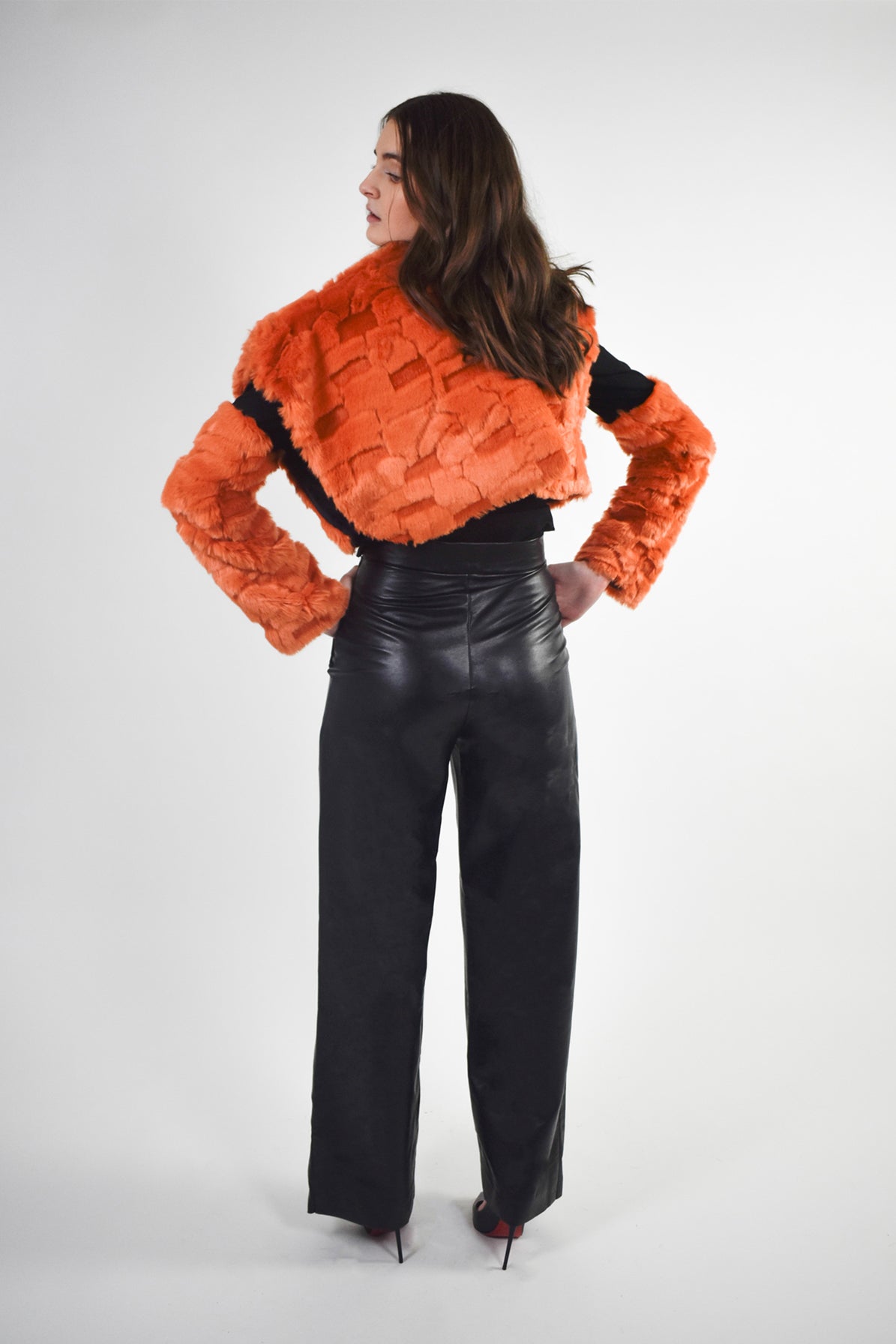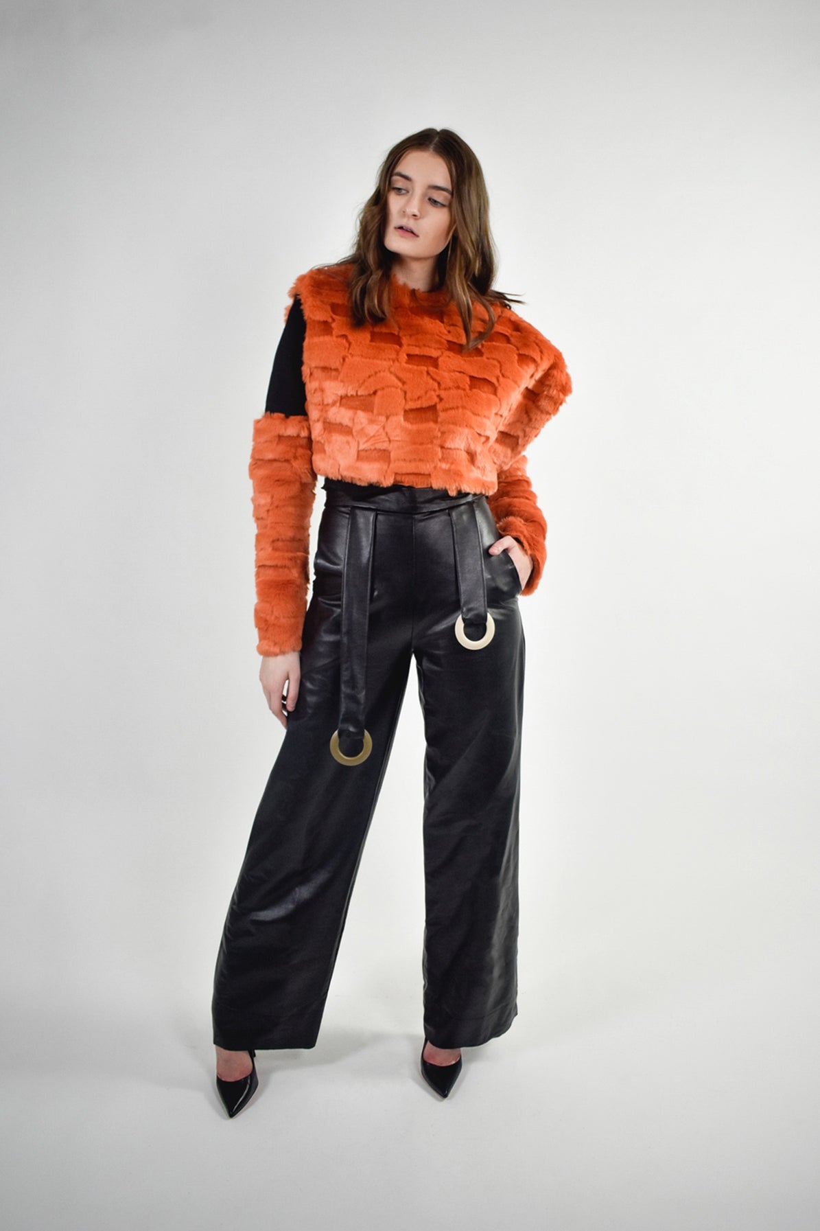 Cet ensemble met à l’honneur la fausse fourrure et se caractérise par sa coupe asymétrique. Il est conçu pour être porté en superposition ou seul. Le chandail manches longues est rehaussé par des touches de fausse fourrure sur les avant-bras.